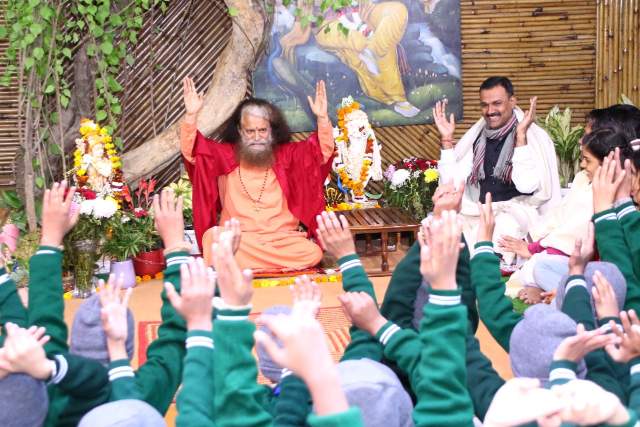 स्वामी जी ने बच्चों और शिक्षकों को पर्यावरण और जल संरक्षण का संकल्प कराया।