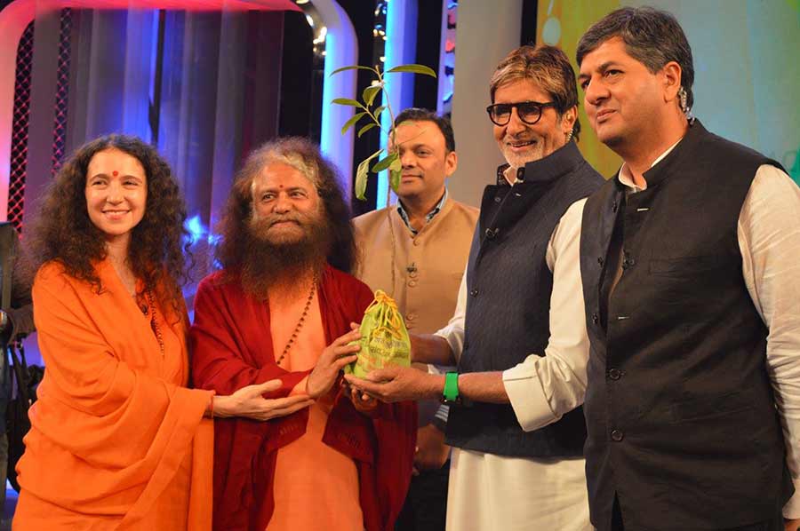 Later Pujya Swamiji and Sadhviji met with Shri Amitabhji cordially inviting him to the upcoming Kumbha Mela, in Haridwar or Ujjain, and honoured him with a sacred Rudraksha plant as a symbol for the incredible Sanitation Ambassador and Green Inspiration that he is for the nation and for the world.