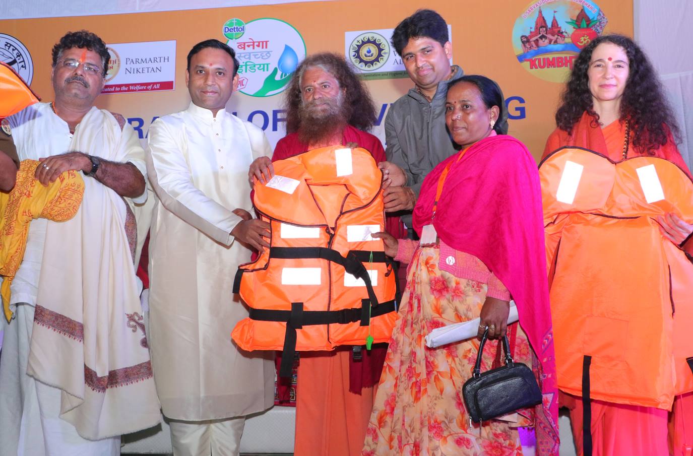 The uplifting event began with the Indian national anthem, followed by a lamp lighting ceremony. The celebration is a joint initiative of the Kumbh Mela administration, Parmarth Niketan, GIWA, Banega Swachh India- Detol, RB and Naavik Sang which recognizes the boatsmen as essential to the Kumbh – without boats and boatsmen, there are no yatris to the sangam. The faithful are safely and efficiently brought to the sangam by experienced boatsmen, insuring an inspiring and refreshing snan in the sacred waters. Over 500 Nisharaj attended the event, along with family members and friends. They were presented life jackets provided by Dettol Banega Swachh India as a gift for their service.