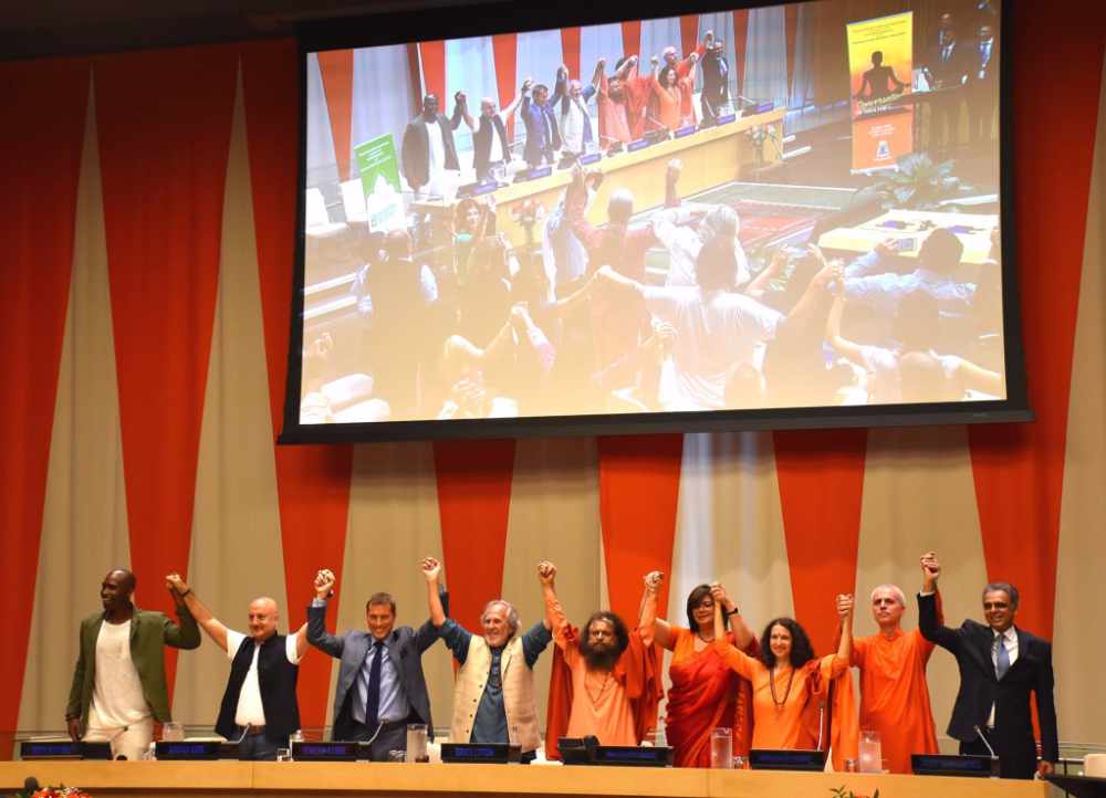 During the end HH Pujya Swami Chidanand Saraswatiji lead a beautiful pledge of oneness, inspiring everyone, including Anupam Kherji, Dr Nata Menabde and the Ambassador of India to the UN, Mr Syed Akbaruddin, to take Yoga from global to local, starting in their own lives and with their own self. All of the participants deeply moved stood up, joining hands, chanting in unison the sound of Om as it powerfully reverberated throughout the hall, ending the historic International Yoga Day conversation on Yoga in Health and leaving everyone with a lot of deep insight and inspiration.