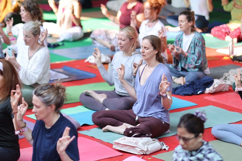 In the afternoon asana sessions, Sri H.S Arun, internationally renowned Senior Iyengar Yoga teacher from Bangalore, taught numerous twists enabling one to ‘Live at Present’ in his session called “Untwist the Twist”. Swami Svatmananda returned with a session on Vedanta: The Ultimate Pursuit of Man”. He explained how Vedanta, an ancient Hindu Sadhana, is the pursuit of knowledge into the Brahman and the Ātman. Participants had the unique opportunity to understand how one can awaken their consciousness through practice in a session by Jai Hari Singh, Chairman and CEO of the Yogasomostodos Foundation. The session on “Heart Chakra Balancing” was conducted by the world-renowned Yogrishi Vishvketu, founder of Anand Prakash Yoga Ashram. The final session of the afternoon called “Voicing the Sounds of Your Chakra ” was conducted in the Sacred Sound Stage by Gumi and Hiroko of Japan.