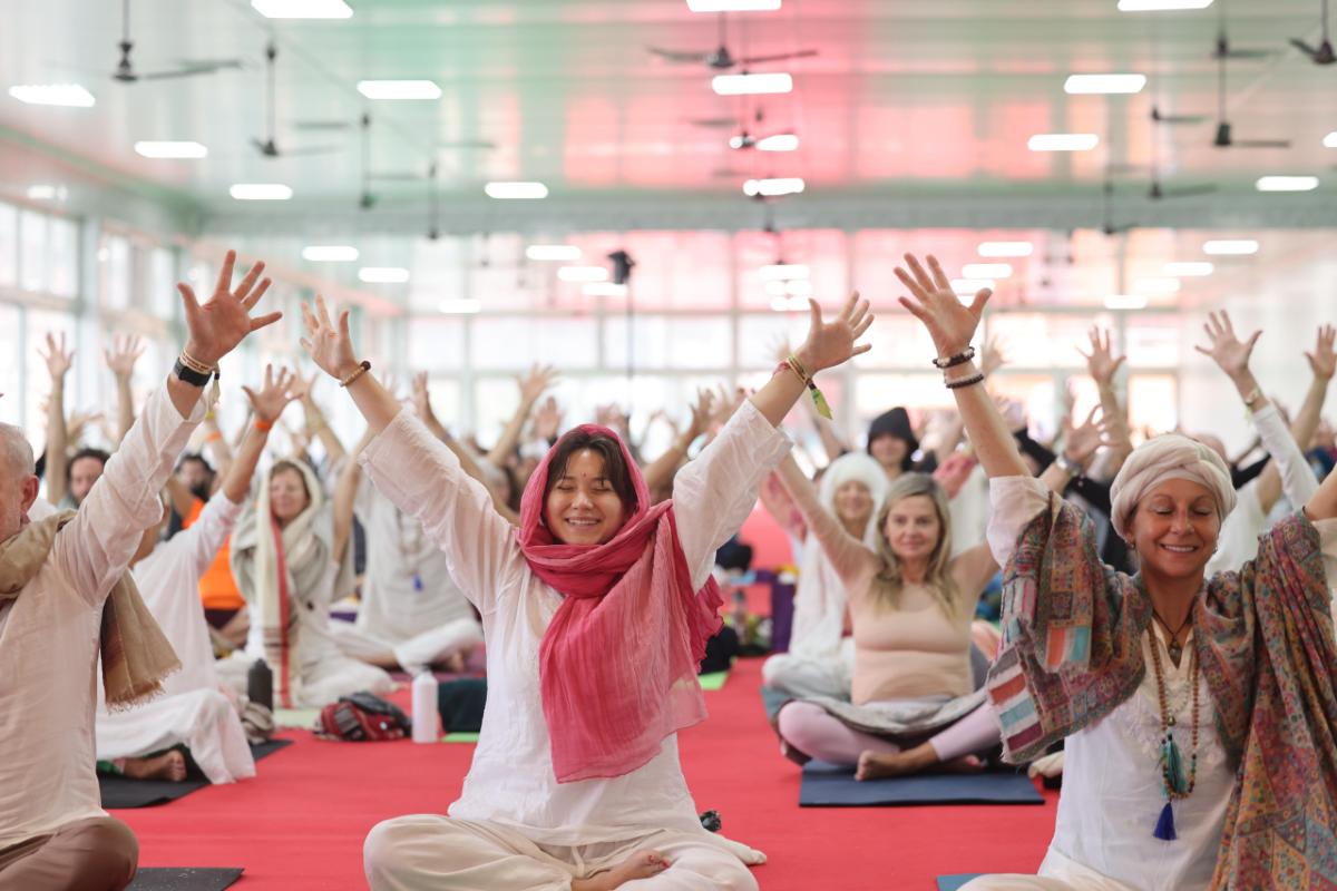 Participants gathered for an early morning Kundalini Sadhana class today at 4:30am with Gurushabd Singh Khalsa and progressed throughout the day with various diverse offerings from teachers all across the world, ranging from yoga, Ayurveda, wellness and several other areas. There was a powerful plenary session on the “Inner Alchemy: transforming Pain into Purpose” with Shri Gauranga Das Prabhu ji, Sadhvi Bhagawati Saraswati ji, Brandon Bays and was moderated by Kia Miller.