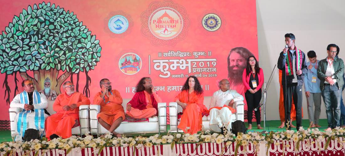 Pujya Swami Chidanand Saraswatiji, President of Parmarth Niketan, and Dr Sadhvi Bhagawati Saraswatiji, Secretary General of Global Interfaith WASH Alliance and President of the Divine Shakti Foundation, welcomed everyone to the Parmarth Niketan, Ganga Action Parivar, Green Kumbh camp. They were joined by Swami Vigyananandji, Prashant Haltalkarji and Sanjeev Sawhneyji from Vishwa Hindu Parishad; Swami Jyotirmayananda; Acharya Devendraji, and other dignified guests.