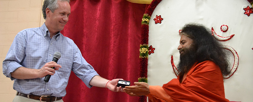 During a special function in Louisville, Kentucky, USA the Mayor of Louisville presented Pujya Swamiji with the “Key” to the City of Louisville. In his speech, the mayor Mr. Greg Fischer said that the people of Louisville feel so blessed that Pujya Swamiji visits them and graces their city with His presence. So they presented Pujya Swamiji with the official “Key” of the City so that it could be Pujya Swamiji’s second home. The Mayor told Pujya Swamiji: “We want you to know how important you are to the City of Louisville. Whenever you come here you inspire so, so many people. We would be very happy to make you an honorary citizen of Louisville.”