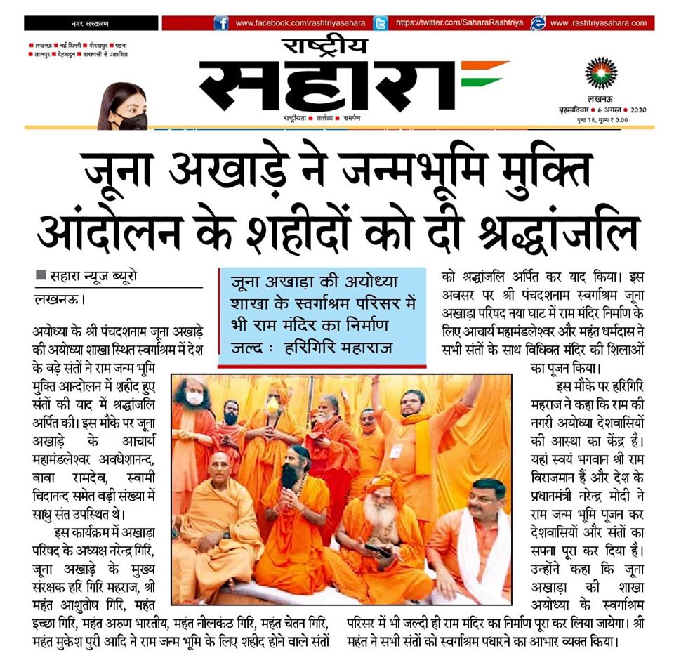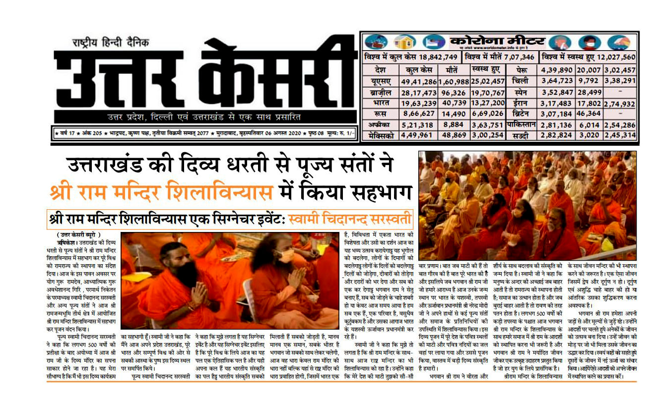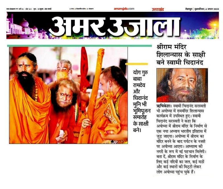 The saints from the divine land of Uttarakhand participated in the foundation stone laying of Shri Ram Temple and gave the message of establishment of Ramrajya to the whole world. On this auspicious occasion of today, Yoga Guru Ramdev Ji Maharaj, Spiritual Guru Awadheshanand Giri Ji Maharaj, Parmartha Niketan’s supreme President Pujya Swami Chidanand Saraswati Ji Maharaj and other pujya saints participated in the Shree Ram Mandir Shilavinyas organized in Shri Ramjanmbhoomi Tirtha area today.