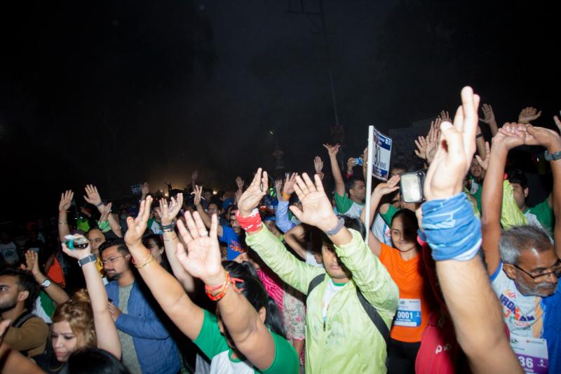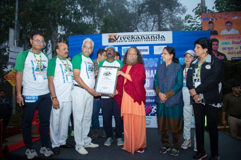 Pujya Swamiji, along with Uttarakhand State Women’s Commission Chairperson Smt. Kusum Kandwal, and VYC Founder Shri Rajesh Sarwadnya, led the pledge to kick off the marathon, symbolizing unity, patriotism, and commitment to a Clean India-Healthy India. Runners across age groups—youth, senior citizens, and even a remarkable 72-year-old runner—joined to show their dedication to environmental balance and physical wellness.