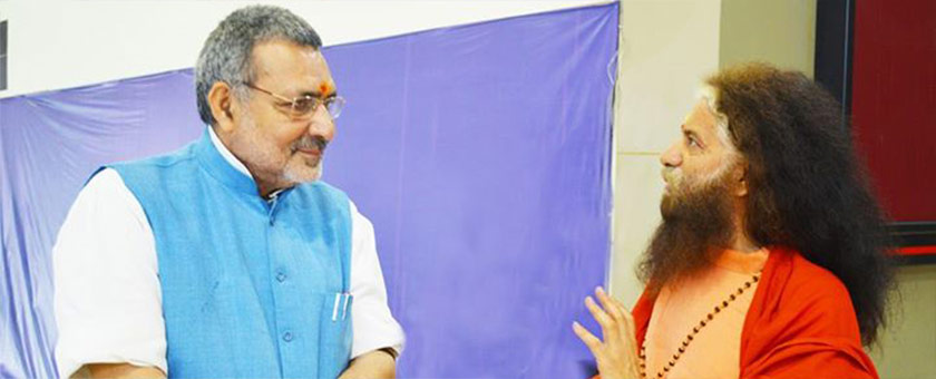 Pujya Swamiji met with Hon’ble Shri Giriraj Singhji, the Minister of State for Micro, Small & Medium Enterprises (MSME), Government of India, formally a minister in the Government of Bihar, in Delhi today. Pujya Swamiji spoke to him about His recent visit to Bihar and the great potential and responsibility that the states through which the National Ganga River passes through have in preserving and conserving their sacred and finite water resources. He also spoke to him about His vision and plans of developing Green Corridors, along both sides of the river bed, which would be no-construction, organic, eco-friendly zones, developed in such a way that when the river’s water passes by the plants, shrubs and trees it not only gets cleaned from any contaminants but also gets added health promoting, healing properties.