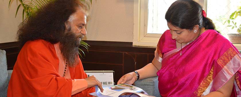 Pujya Swami Chidanand Saraswatiji and Sadhvi Bhagawati Saraswati met with Union Minister of Human Resource Development, Smt. Smriti Iraniji in Delhi. Together they discussed a number of projects, including the inauguration of the Brightland International School in Chandrapuri, Rudraprayag, a school that had been washed away completely in the floods and rebuilt by Divine Shakti Foundation and Ganga Action Parivar, with the generous sponsorship of Mahavir Seva Sansthan, Kolkata, as well as with the on-ground partnership with SEEDS, in a new location for 200 schoolchildren, as well as 11 other school projects being undertaken.