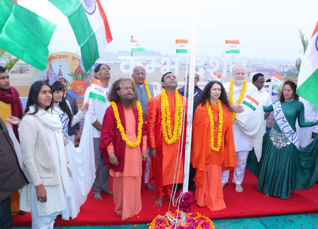 The Parmarth Niketan Ganga Action Parivar, Global Interfaith WASH Alliance ‘Green Kumbh’ camp led by Pujya Swami Chidanand Saraswatiji, held a beautiful and celebratory flag-hoisting ceremony on the banks of the Sangam this morning. The raising of the tiranga, on the banks of the sacred Sangam at Kumbh Mela, illuminates the coming together of all peoples of the nation as one. Joining Pujya Swamiji were Shri Madhusudan Naiduji, head of the Muddenahalli campus of Satya Sai Baba, and Sadhvi Bhagawati Saraswatiji, President of the Divine Shakti Foundation and Secretary-General for the Global Interfaith WASH Alliance; Shri RS Goenkaji and Shri SK Goenkaji, heads of Emami Ltd, joined by their friends and family; and hundreds of devotees from across the country and the world.