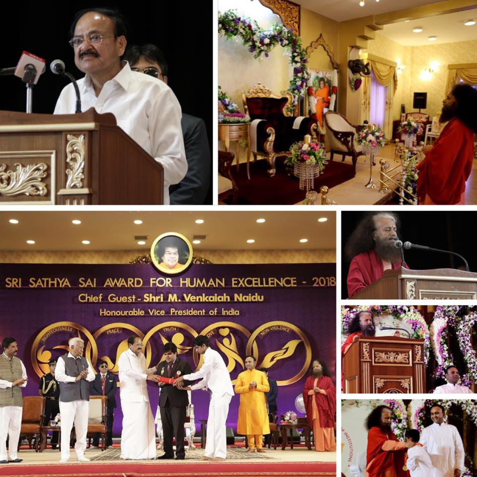 Updates from @PujyaSwamiji’s recent visit to #WorldYouthMeet & #SathyaSaiAwards, w/ @MVenkaiahNaidu & Honble Governor, Pujya Sri Madhusudanji, Cricketer Sunil Gavaskar & others in honour of Pujya Sathya Sai Baba’s 93rd Birthday now online: https://t.co/WCdHerrJkt #WYM2018 pic.twitter.com/qg9nMx5j0X